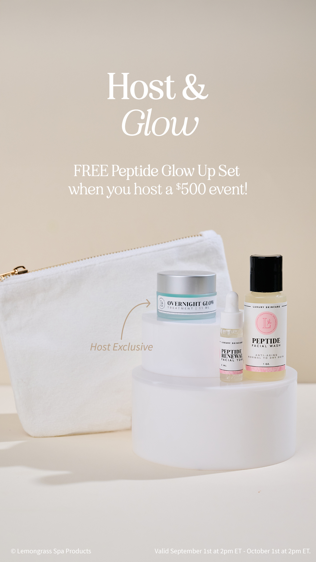 | | Host a $500 event and receive a FREE Peptide Glow Up Set! Set features mini Peptide Facial Wash, mini Peptide Renewal Toner and host exclusive mini Overnight Glow Treatment inside a white velvet bag. *Mini Overnight Glow Treatment is not available for individual purchase. | | |